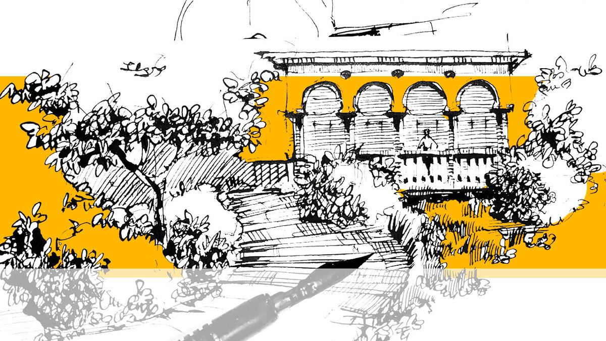 Рисую набросок пейзажа пером и тушью. Дорожка и арочная галерея.