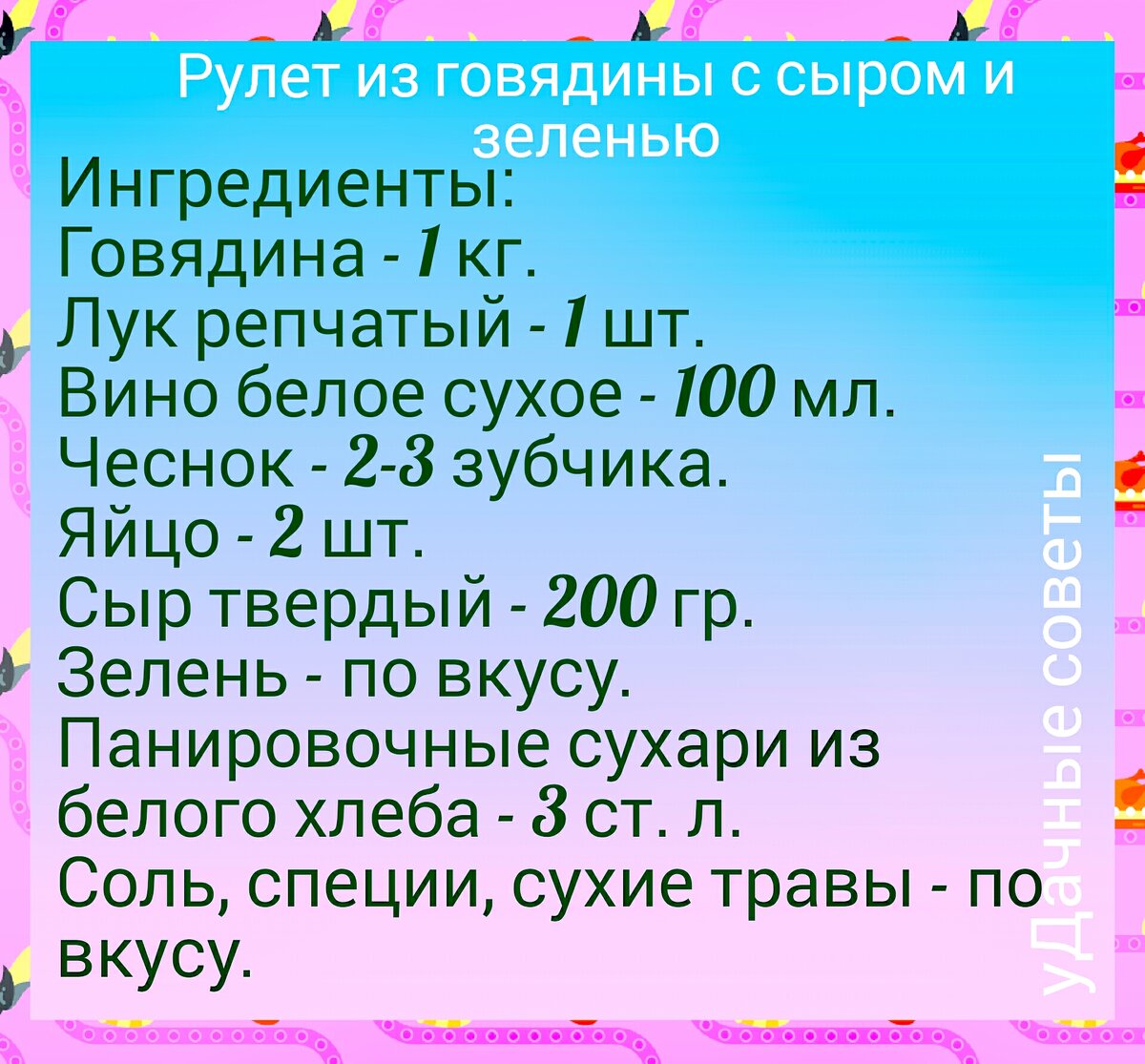 Очень простой и вкусный рулет из говядины можно приготовить для праздничного стола. Быстрым его не назовешь, ибо запекается он около двух часов, но сама подготовка к запеканию много времени не занимает. Итак, все просто. Большой кусок говядины разрезаем вдоль волокон так, чтобы получился один пласт мяса. Для этого до конца мяса не разрезаем, оставляя до конца примерно один сантиметр. Получается своеобразная книжка-гармошка. Слегка отбиваем пласт мяса, теперь импровизированные сгибы практически не заметны. Солим и перчим мясо. Зелень измельчаем. Лук режем полукольцами. Сыр натираем на крупной терке и смешиваем с сырыми яйцами и панировочными сухарями. Добавляем в смесь измельченный чеснок и любимые специи. Затем распределяем получившуюся смесь по мясному пласту, оставив с одного края пустыми пару сантиметров. Посыпаем начинку зеленью, и сворачиваем плотный рулет так, чтобы незаполненные начинкой 2 см пласта оказались с наружного края. Фиксируем рулет плотной нитью. Лук выкл