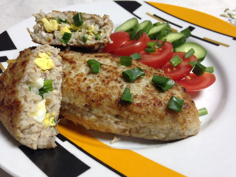 Зразы с гречкой и яйцом - это мясные котлетки с гречнево-яичным гарниром внутри, получается блюдо 3 в 1, так как помимо вышеописанных ингредиентов в состав начинки еще входит и морковь. Количество - 6 шт., Время приготовления - 40 минут. Ингредиенты: · говяжий или свино-говяжий фарш - 500 гр., · чеснок - 2 зубчика, · кусок черного хлеба, · 3 средние луковицы, · яйцо - 2 шт., · гречка - 0,5 стакана, · зелень резаная - 1 ст.л., · сухари панировочные или мука, · соль, черный молотый перец - по вкусу Способ приготовления: Начинка: 1. Морковь натереть на крупной терке и поджарить вместе с гречневой крупой на оливковом масле. 2. Когда гречка зарумянится, влить в сковороду кипяток накрыть крышкой и варить на малом огне 20 минут. 3. В гречку также можно можно добавить сушеные или свежие помидоры и тушить начинку с ними. Зразы: 1. Перемолоть мясо на фарш, желательно крупного помола. 2. Добавить в фарш рубленную зелень, размоченный хлеб (можно размочит в молоке или воде), вбить 1 яйцо. 3. На