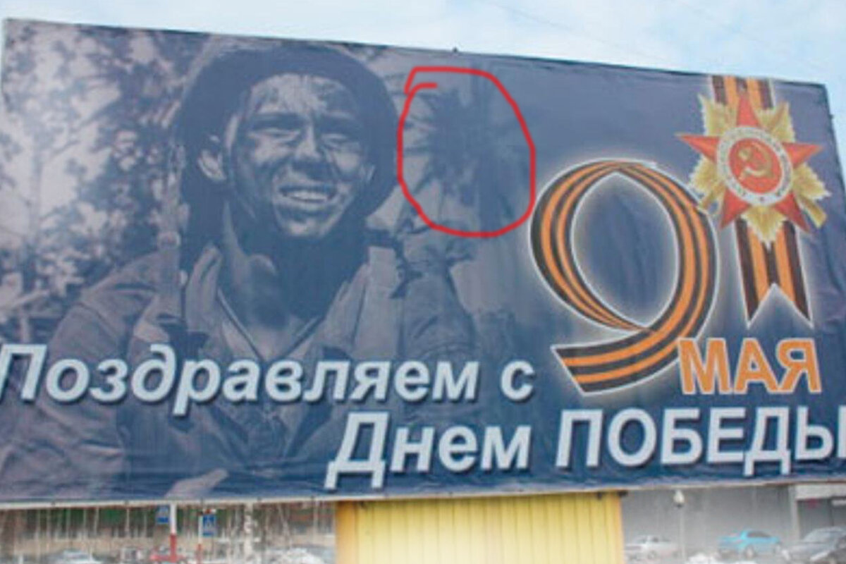 На улицах городов начинают появляться баннеры,плакаты и граффити посвященные Великой Отечественной войне.Казалось бы, всё хорошо,напоминание о великом подвиге народа.Но если бы эти "баннеры" были правильными. Начнем с самого неочевидного. Казалось бы, просто фотография советского солдата и поздравление с Днем Победы.Во-первых, на фото американский пехотинец. Во-вторых, пальмы на фоне.Это был самый "легкий" ляп, давайте дальше. Опять же, вроде всё нормально,но это американские солдаты. Такую ошибку вряд ли допустили случайно, ведь надо было закрасить флаг США.Неужели не нашлось настоящих фото советских солдат? Неужели так сложно перепутать немецких и советских солдат?Но, авторам это удалось.При наличии интернета авторы, не смогли найти фото советских солдат.Возможно,авторы вовсе не знали историю. Немецкий солдат с гранатой поздравляет с Днем Победы.К тому же это гражданский флаг Сербии(баннер установлен в России). Реклама суши и пиццы на фоне ордена Великой Отечественной войны.Серьёзо?