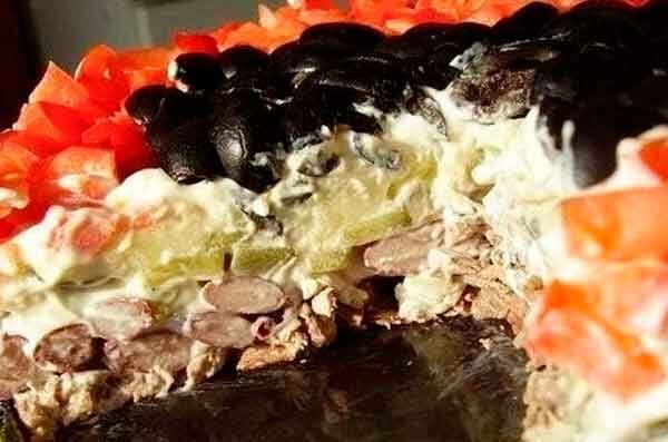 Слоеный салат с красной фасолью и говядиной – простой рецепт для любого праздничного стола. Фасоль используют консервированную в банке, так и вареную. Салат готовится просто и быстро при условии, что все ингредиенты приготовлены заранее. Состав: 450 г говядины; 1 шт. репчатого лука; 250 мл майонеза; 0,5 л банка красной фасоли; 100 г маринованных огурцов; 200 г вареного картофеля; 120 г помидор черри; 80 г маслин. Приготовление слоеного салата с красной фасолью и говядиной. Для рецепта необходимо заранее подготовить ингредиенты. В кастрюлю с кипящей водой кладут кусок говяжьего мяса, после чего варят на маленьком огне примерно 1,5 часа. За полчаса до готовности бульон солят по вкусу, добавляют лавровый лист. По прошествии определенного времени мясо вынимают из кастрюли на тарелку и охлаждают. Клубни сырого картофеля моют, складывают в отдельную кастрюлю, заливают холодной водой, ставят на средний огонь вариться до готовности картошки. Как только картофель в мундире сварится, горячую