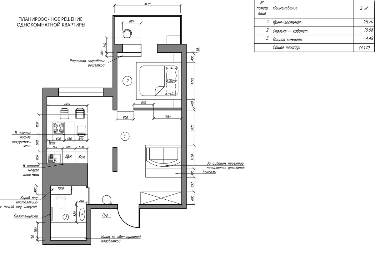 Лофт для девушки студентки Дизайн проект однокомнатной квартиры 44 кв.м. для девушки студентки. Задача: перепланировать однокомнатную квартиру в 2-х комнатную, выделить спальню с полноценным рабочим местом, а кухню и гостиную сделать общими. Стилевое предпочтение - лофт. Планировка Все не несущие перегородки убрали в результате чего получилось открытое пространство с несущей колонной, балкон утеплили и присоединили. В зоне балкона организовали небольшой кабинет, спальню изолировали спальню, а на остальном пространстве организовали кухню гостиную. Кухня гостиная Бетонный потолок отшлифовали, отгрунтовали и покрыли лаком, разводка электрики на потолке выполнена с использованием ретро проводки, на стенах частично использовали ретро проводку. Отделка стен - декоративная штукатурка с эффектом бетона и кирпич с заводским клеймами. И королева интерьера - перегородка из стеклоблоков, а еще роскошные амбарные двери, бетонные подвесы в зоне кухни и шкаф с дверцами - жалюзи. Несмотря на н