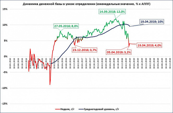 Годовые темпы её роста 4%, это ниже инфляции, которая по итогам апреля ожидается на уровне 5,1%. А значит в реальном выражении денежная база сокращается.