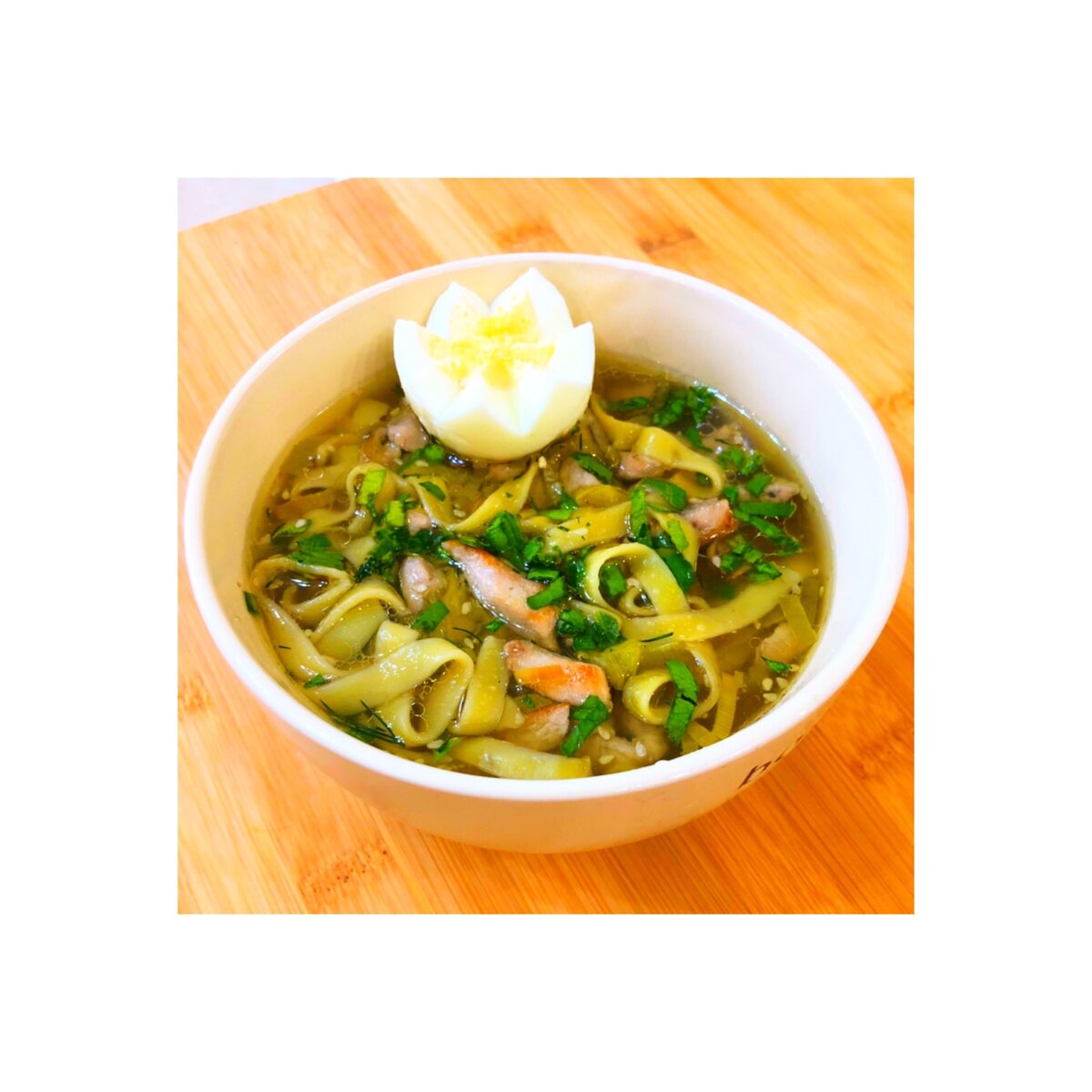 Здравствуйте, мои хорошие😃🌹 Сегодня приготовила вот такой супчик. Мы все его очень любим. Он получается наваристым и в то же время легким. Куриная грудка - 400 г Имбирь - 1 десертная ложка (у меня сушёный) Чеснок - 1 зубчик Соевый соус - 3 ст.л. Лук-порей - 50 г Кунжут - 2 ст.л. Лапша (вермишель) - 30 г Яйца, зелень, масло растительное, соль Приготовление: В разогретое растительное масло кладем нарезанную грудку, посыпаем имбирем, солим, вливаем соевый соус и тушим в соке, которую даст грудка. Когда жидкость испарится добавим лук-порей, чеснок и кунжут, жарим пока грудка не подрумянится. В кастрюлю наливаем воды, ставим на огонь и выкладываем туда нашу грудку, добавляем лапшу, которая держит форму и не разваривается. В тарелку добавляем отварное яйцо и зелень. Суп получается густой, и если вы используете длинную лапшу, удобнее есть палочками или вилкой. Ну очень вкусно, правда😋🍜