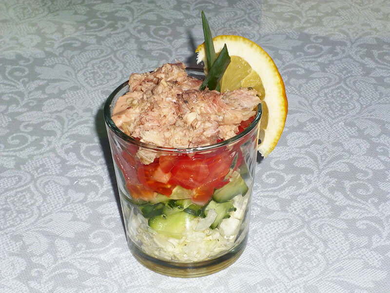 Чем салат-коктейль отличается от обычного? Наверное, только способом подачи. Подают его в стеклянной прозрачной посуде, благодаря которой видны слои салата. Сегодня предлагаю сделать простой и красивый салат-коктейль с красной рыбой. Время приготовления – 10 минут Количество порций – 5 Ингредиенты Способ приготовления 1. Пекинскую капусту шинкуем, солим, мнем руками для мягкости и выделения сока. Выкладываем первым слоем в форму, в которой будет подаваться салат. 2. Следом нарезаем огурцы. Они пойдут вторым слоем. 3. Мелко нарезаем помидор и выкладываем третьим слоем. 4. Подготовим заправку для салата. Для нее буду использовать сок лимона и масло без запаха. Также можно взять жидкость из-под рыбы. Полученной смесью, разделенной в равных долях на все порции, поливаем слой из помидор. 5. И уже после заливки выкладываем измельченную консервированную горбушу. Подаем его, украсив свежей зеленью и долькой лимона. Приятного аппетита! Чтобы не пропустить новые рецепты, ставьте 👍 и подписыва