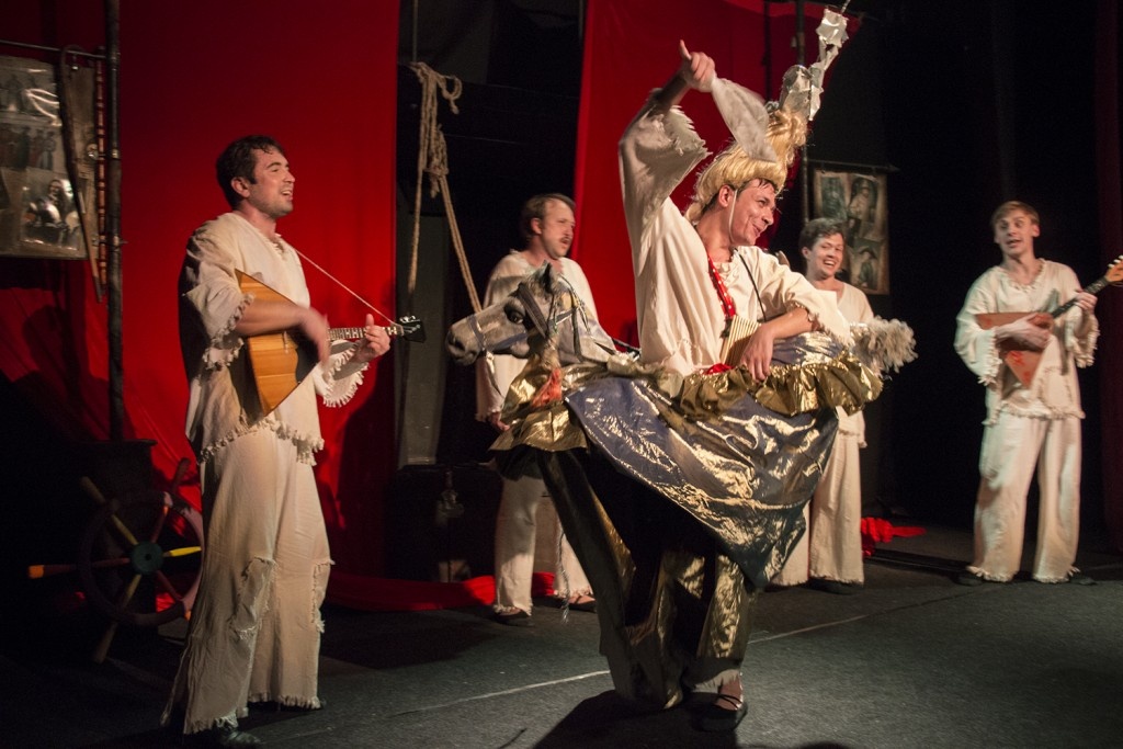 И то, что мы видели на сцене, это не просто спектакль, это спектакль-скоморошина. Работа была проведена с глубоким погружением в тему, вплоть до музыкальных инструментов. Актеры играют не только на сопилках, балалайках и барабанах, но и на весьма экзотических инструментах, таких, например, как колесная лира, ханг и рейнстик (посох дождя). А многочисленный реквизит скоморохов помещается в огромном сундуке, который они используют по разным назначениям. Декорацией же служат куски ткани. На сцене минимализм.