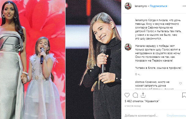 27 апреля в Живом Журнале популярный блогер Лена Миро опубликовала очередной материал с критикой. На этот раз писательница раскритиковала победу дочери Алсу – Микеллы Абрамовой. «Начала карьеру с победы!» - такой заголовок в дневнике Миро. Блогерша вспомнила, как она писала про дочь певицы и внучку нефтяного олигарха. Тогда у нее даже мыслей не было, чем все это может закончиться. «Ну, мало ли безголосых детей российских звёзд пытаются выдавить из себя ноты? Обычно все эти муки для зрителей заканчиваются довольно быстро, если это - не Кристина Орбакайте, дочь Пугачевой», - написала Лена. Она считает, что Микелла Абрамова каким-то чудесным образом стала 26 апреля победительницей музыкального проекта. Лена Миро понимает, какое завершение будет у ревизии, которую начали из-за бунта зрителей в комментариях социальных сетей. По инициативе генерального директора Первого канала Константина Эрнста идет проверка результатов. Блогер ЖЖ предсказывает, как может быть: «Ошибок не обнаружено, всё ч