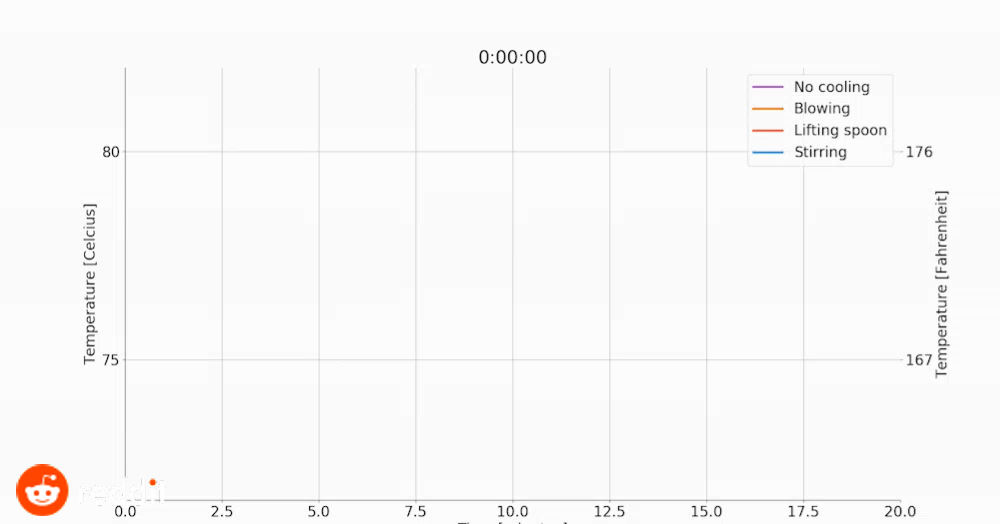 — перемешивал. Быстрее всего чашка остыла от дуновений — чтобы дойти до приемлемой температуры, ей потребовалось меньше пяти минут. На три минуты больше потребовалось способу с поднятием ложки. Перемешивание почти не обогнало естественное охлаждение. Посмотреть на ход исследования можно на YouTube-канале реддитора.