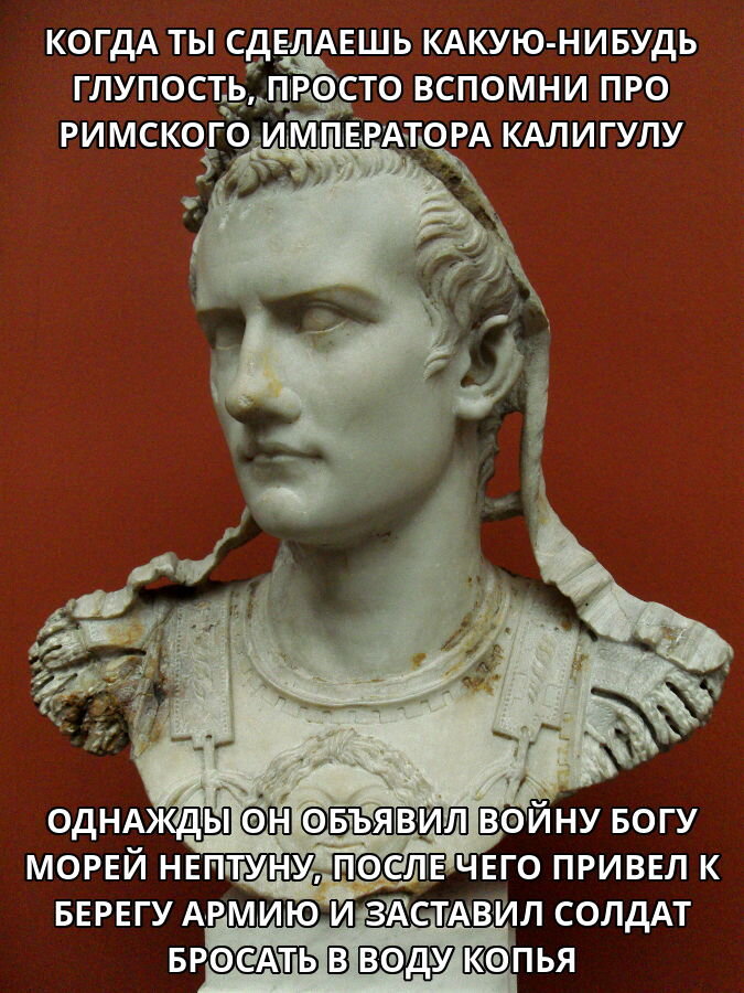 Калигула: Император-Бог Самовлюбленный император провозгласил себя Богом и приказал поклоняться своей персоне. В честь самого себя он построил большой храм, где установил золотую статую, которую жрецы должны были каждый день переодевать в ту одежду, в которой Калигула выходил к плебсу. Кроме этого, император присутствовал на ежедневных жертвоприношениях, совершаемых в его божественную честь, и казнил тех, кто поклонялся другим Богам.Однажды Калигула даже решил завладеть морскими просторами и объявил войну Нептуну — древнеримскому Богу морей и океанов. Он собрал свое войско, привел его к берегам моря и приказал метать копья и стрелы в воду, дабы победить заклятого врага. Гай Юлий Цезарь Август Германик (12-41гг.н.э.) прославился как один из самых жестоких правителей Римской Империи за весь период ее существования. Более известный как Калигула, 18 марта 37 года он был провозглашен римским Сенатом Принцепсом. Первые несколько месяцев своего правления, проявляя заботу о своем народе и госу