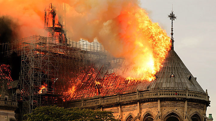Во Франции жертвой большого пожара стал Ссобор Парижской Богоматери. Для Франции эта национальная святыня означает примерно то же самое, как для нас Кремль или собор Василия Блаженного. Собор Парижской Богоматери, один из старейших в мире храмов, начали возводить ещё в 12-м столетии – в дальнейшем собор достраивался и перестраивался.