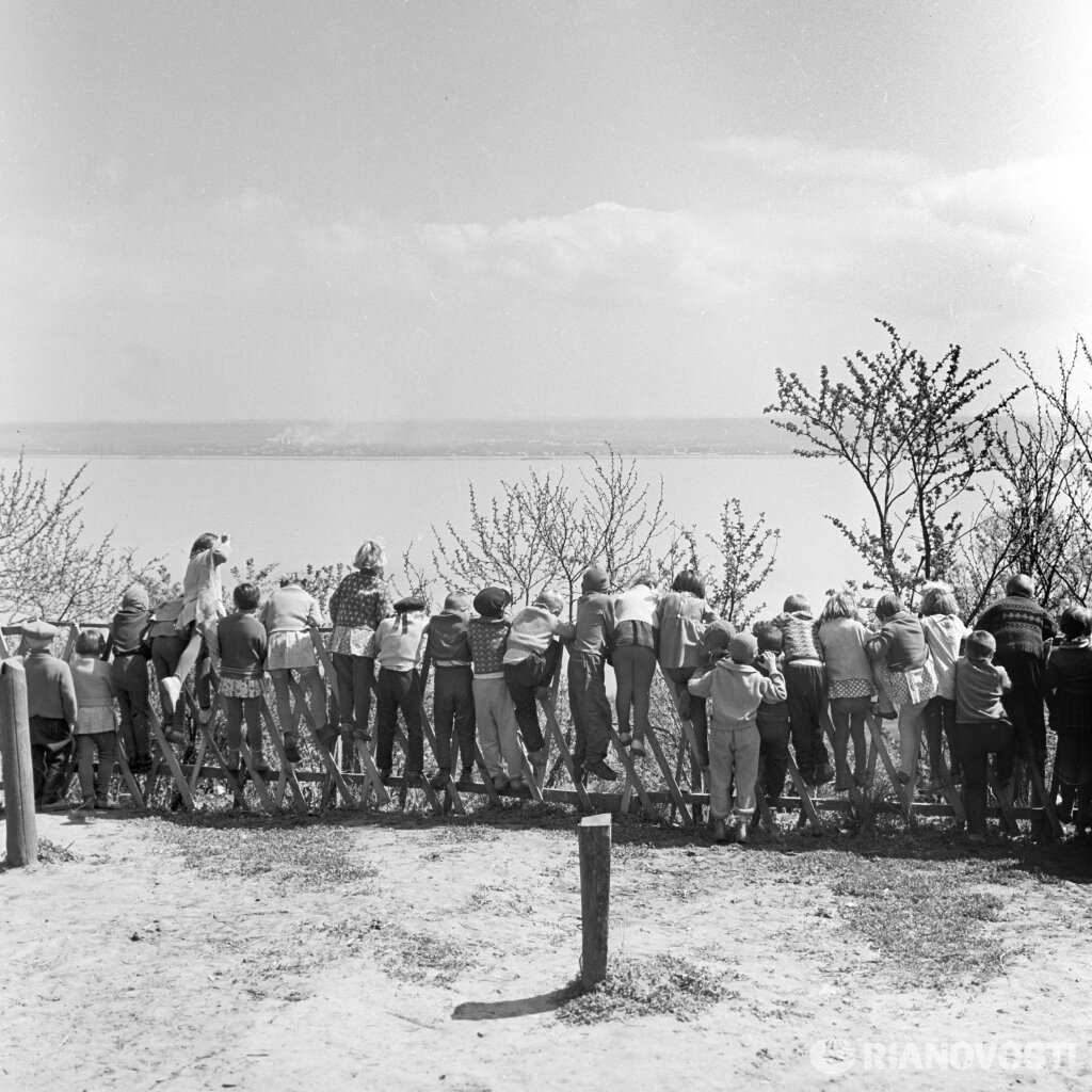 1 апреля 1969 года. Ульяновские дети, забравшиеся на забор, смотрят на Волгу.