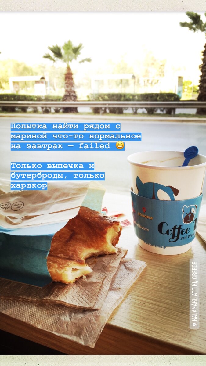 День должен был начаться с общего мита в 9 утра на пирсе. Поэтому уже в 8 я побежала на поиски завтрака 😏 Проскакав по округе, обнаружила, что выбор невелик: везде из еды только булки 🙈😅 Взяла с сыром и ветчиной и еще со шпинатом и сыром. Вторая оказалась просто отличная, по вкусу эта конкретная булка была похожа на пирожок с луком и яйцом (моя бабушка делала такие, было потрясающе вкусно!) 😋 Ну и кофе, конечно) Около 9 вся команда подтянулась на борт, мы познакомились с ребятами и сразу пошли затариваться едой и напитками на ближайшие несколько дней. Закупка вообще веселое мероприятие, вспомнила, как мы раньше в Питере в лесные походы это делали 😄 Кстати, местные магазы у марины бесплатно доставляют пакеты прямо на пирс 👌 Распихали еду по яхте, послушали инструктаж от капитана, и уже около 12 вышли из порта. Маршрут на все дни выглядит так: Если смотреть по карте, то на сегодня план был добраться от голубой точки Афин до красной точки Суниона: Сунион в первую очередь известен