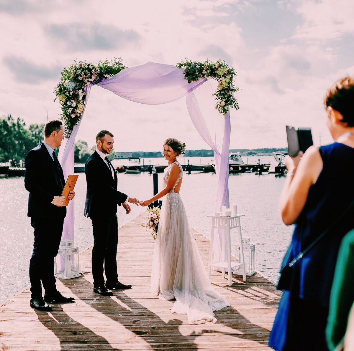 Пожалуй, самый важный и волнительный момент свадебного дня – это момент заключения брака. Сегодня многие молодожены предпочитают разделять день официальной регистрации в ЗАГСе и день проведения свадебного банкета. Тем самым, отпадают такие вопросы, как: перемещение большого количества гостей из ЗАГСа в ресторан, жесткие временные рамки, ограничения по количеству гостей. Всего этого можно сразу избежать, если выбрать «Выездную церемонию». Нет лучшего места для этого события, чем территория Вашей площадки. Это отличная возможность собрать вместе всех близких друзей и родных, при этом сделать все по тем правилам, которые придумываете Вы сами. Обычно, «Выездную регистрацию» проводит церемониймейстер. Однако, если вы захотите, Вашу церемонию могу провести я, как ведущий Вашей свадьбы. У меня так же, как и у церемониймейстеров, есть разные интересные романтические сценарии, которые мы можем отредактировать и добавить то, что подходит именно Вам. При этом, за это я не беру никакого дополнител