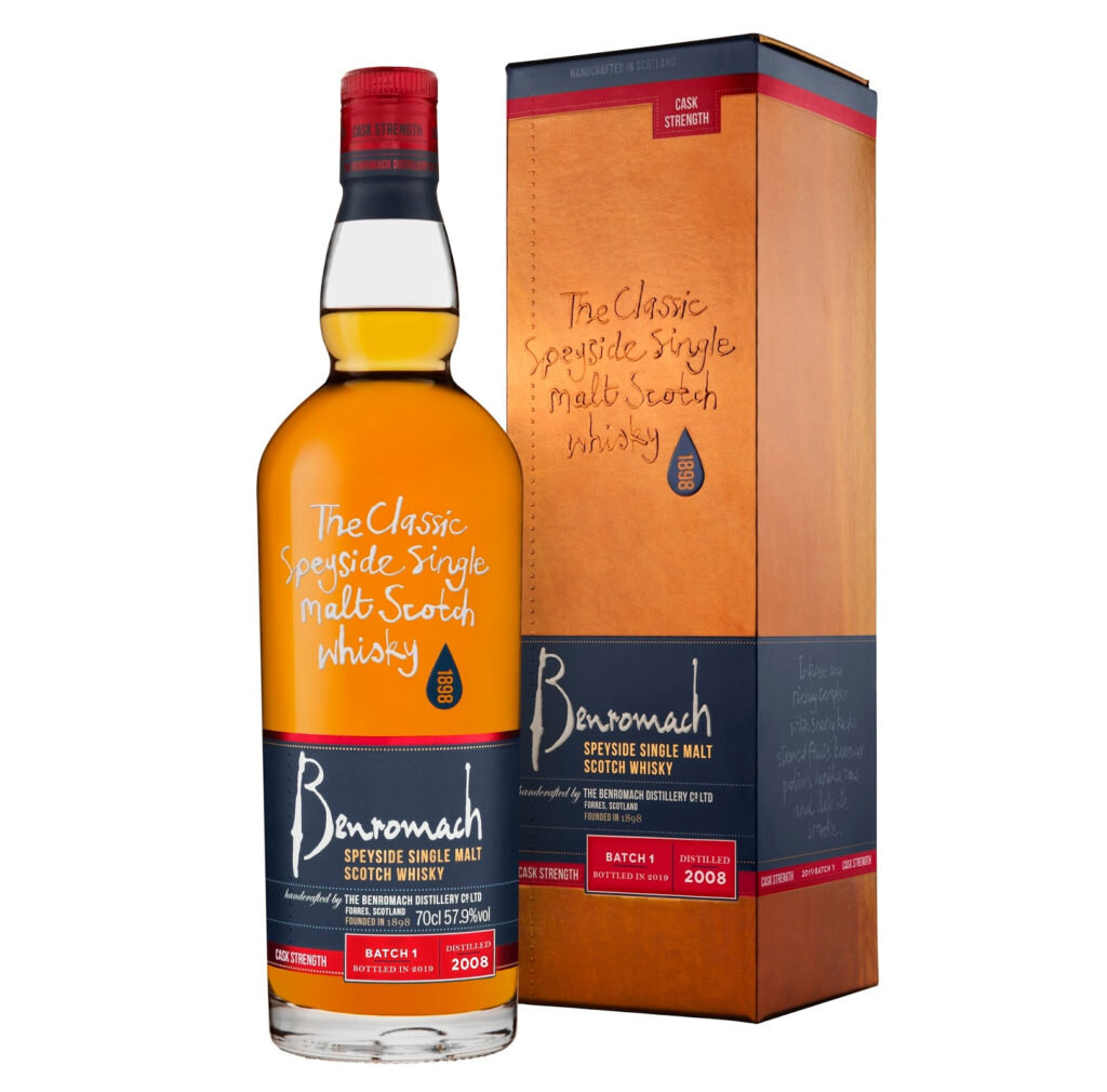 Мастера винокурни Benromach объявили о расширении линейки односолодового виски Classic новым винтажным изданием Benromach Cask Strength Vintage 2008 Batch 1. Новинка появилась в результате пересмотра принципов формирования ассортимента Benromach и пришла на смену регулярному релизу Benromach 100° Proof. По мнению руководителя Benromach Кейта Крукшенка (Keith Cruickshank), переход на винтажные издания будет высоко оценен ценителями виски, так как они получат возможность наблюдать динамику характера виски год от года. Спирты для издания были получены в 2008 году и выдерживались в комбинации бочек первого заполнения из-под бурбона и хереса. Виски разлит в возрасте 10 лет при бочковой крепости 57.9 ABV. Виски обладает цветом золотистого янтаря. Аромат раскрывает яркие хересные ноты, тушеные яблоки, груши, акцентами ванили, поджаренного солода в развитии и намеками ментола. Добавление воды раскрывает ноты пчелиного воска и торфяного дыма со сладкими ароматами спелых бананов, киви и меда.