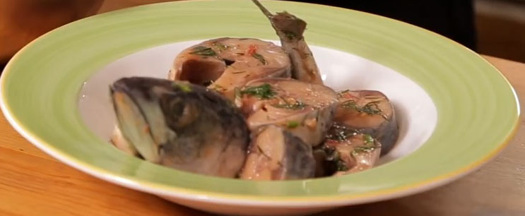 Ингредиенты: · Свежемороженая скумбрия – 1шт · Луковица средняя – 1 шт · Средний помидор – 1шт · Зубчик чеснока – 1 шт · Уксус столовый 9% – 1 столовая ложка · Масло растительное рафинированное – 1 столовая ложка · Соевый соус – 2 столовых ложки · Сахар – одна десертная ложка · Соль – 1 чайная ложка · Укроп – один пучок Рецепт Скумбрию очистить от внутренностей и разделать на звенья. Причем голову, плавники и хвост выбрасывать не нужно – они тоже пойдут в дело. Голову следует очистить от жабр, а на хвосте сделать пару разрезов вдоль. Нарезанную рыбу сложить в емкость для маринования. Маринад Лук нарезаем перьями и складываем в чашу. Туда же добавляем нарезанный укроп, причем стебли нужно нарезать как можно мельче – они придают основной аромат. Помидор разрезаем на небольшие дольки и добавляем в чашу. Следом отправляем мелко нашинкованный чеснок, соль, сахар, растительное масло, соевый соус, смесь перцев и уксус. Все хорошенько перемешиваем и ОБЯЗАТЕЛЬНО выжимаем из овощей сок. Д