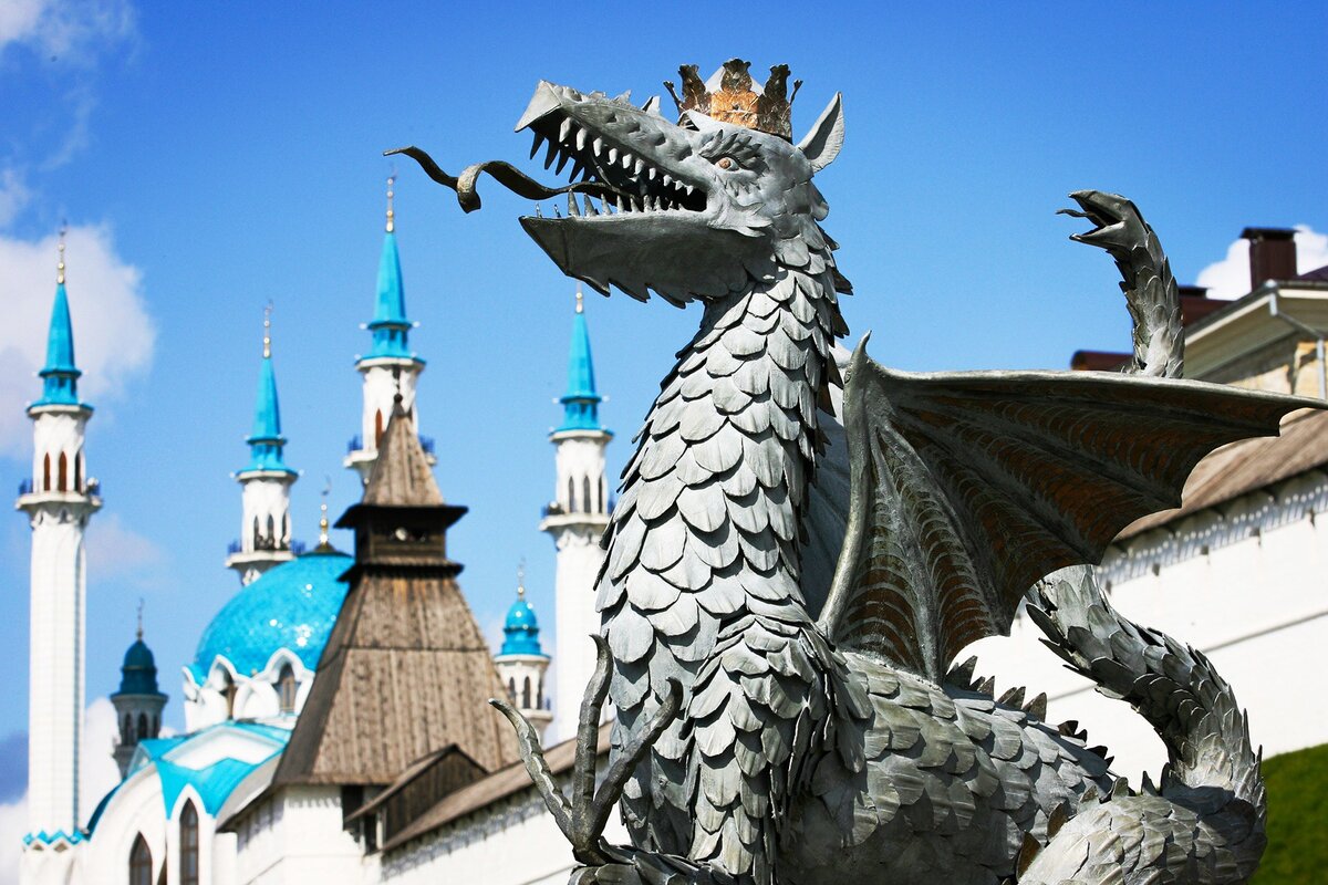 8. Памятник дракону Зиланту. Зилант был подарен Казани одной рекламной группой и скульптором Маратом Губайдуллиным в честь празднования 1000-летия города в 2003 году. Крылатый змей с давних времен был символом татарской столицы, ее даже называли «змеиным царством». По древней казанской легенде Зилант обитал на горе у реки Казанки близ впадения той в Волгу. Гора была прозвана зилантовой и дала имя православному монастырю, построенному на ней ещё в 16 веке. Сейчас, по легенде, змей находится в озере Кабан и охраняет ханские сокровища царицы Сююмбике. Его изображение находится на флаге и гербе Казани, а также крылатого змея можно увидеть во многих местах города: на фонтанах, кованых решетках оград, вывесках, флюгерах и фасадах домов. Находится кованая скульптура Зиланта на улице Баумана рядом с выходом из метро «Кремлевская», что неподалеку от Казанского Кремля. Отмечу, что Зилант со станции метро – не оригинал, а авторская копия первоначально установленного. Первого крылатого змея вандалы изуродовали в 2011 году после матча «Рубина» с одним из московских клубов. Тогда автор первой скульптуры Марат Губайдуллин изготовил для входа в метро новую фигуру Зиланта, более стройного, изящного, стоящего на двух лапах и местами позолоченного дракона.