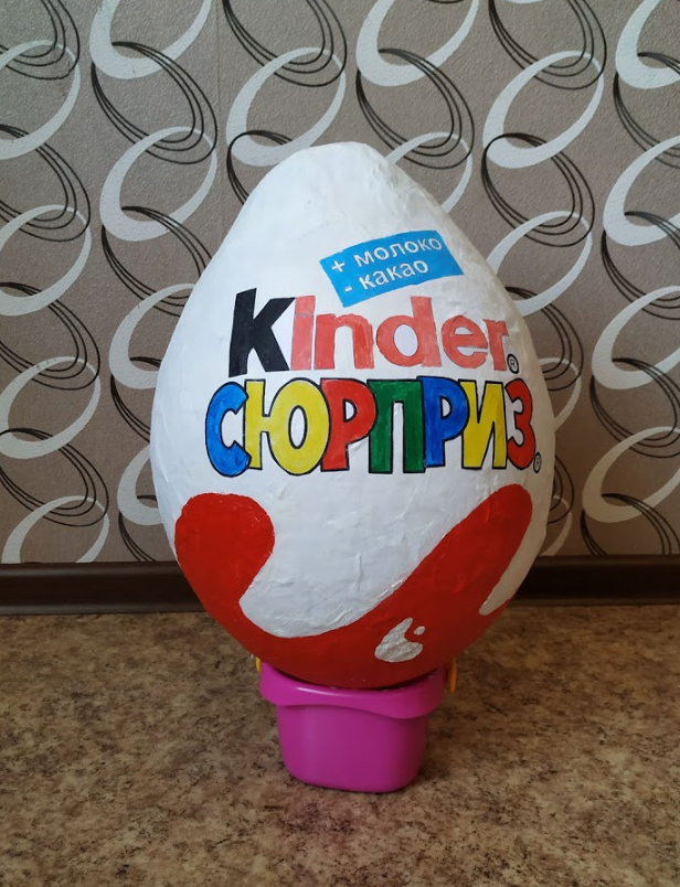 Ребёнка, пожалуй, обычным киндер сюрпризом уже не удивишь. А вот яйцо размер в 65 см может впечатлить! Это ведь ого-го. Такой подарок оказывает впечатление не только на вашего ребёнка, но и на окружающих :). В духе "ого, пап, ты посмотри, тут киндер сюрприз размером с человека! никогда таких не видел!" Для четырёхлетнего ребёнка оно кажется достаточно крупным. Хотите такой же киндер вашему ребёнку? Это не сложно, смотрите как это сделали мы. Понадобится совсем не много: краски, у нас были акриловые -красные -желтые -синие -белые -много листов бумаги, можно с текстом на одной стороне. -салфетки Клей, можно и клейстер. У нас был ПВА. -клей ПВА -бочонок за 50 р -Качественный шарик -Лента -Терпение и усидчивость :)- обязательно Начинаем делать. Шарик, он должен быть достаточном крупным (настолько, насколько вы хотите впечатлить Вашего ребёнка) и, обязательно прочным. Будет очень обидно, если в процессе работы он лопнет. А это не исключено. Рисунок шарик может отпечататься на внутренней с