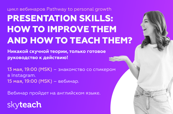 В феврале вы узнали, как продвигать личный бренд в Instagram, а в мае мы расскажем, как преподавателю английского языка грамотно преподнести себя аудитории и научить этому студентов. На вебинаре “Presentation Skills: How to Improve them and How to Teach them?” приглашенный эксперт ELT с Мальты Niki Stokes (BA in Management, DELTA) расскажет: Когда: 13 мая, 19:00 (MSK) – знакомство со спикером в Instagram. 15 мая, 19:00 (MSK) – вебинар. Каждый участник получит бесплатное видео “Teaching tricks and treats when teaching speaking” от спикера Евгении Головачевой. Дополнительно можно приобрести: Вебинар пройдет на английском языке.
