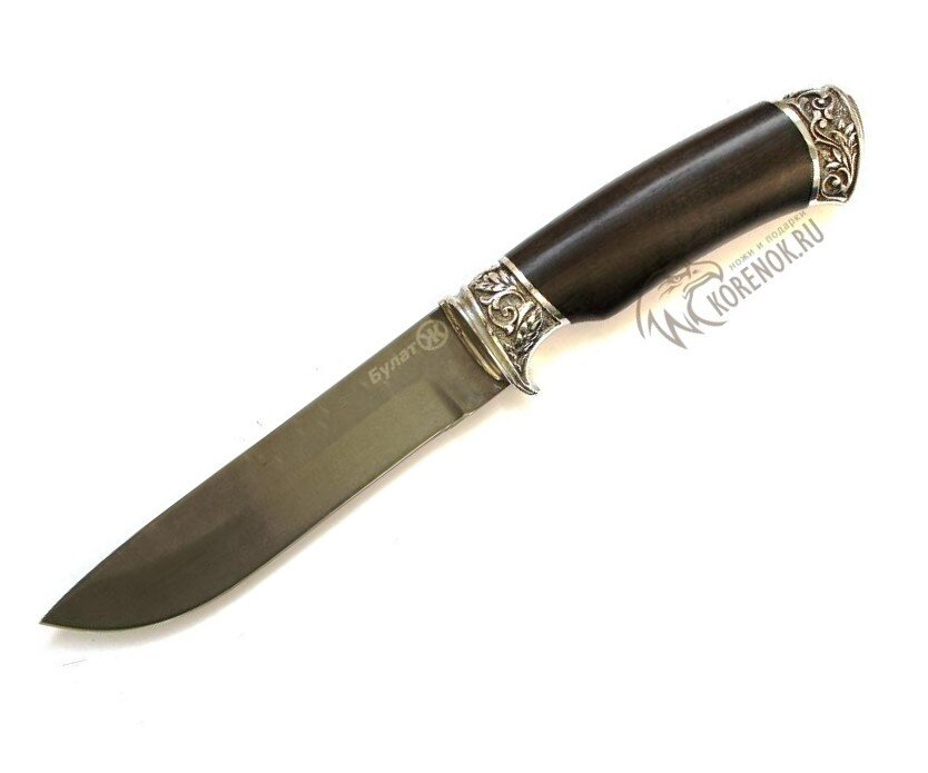 Нож Клык (булат, черный граб, мельхиор) вариант 2 Изготовлен в мастерской Жбанова г. Ворсма Нижегородской обл. Данная мастерская является одной из крупнейших в г. Ворсме. Большой ассортимент и хорошие цены. Выпускаются ножи от самых дешевых до подарочных, авторских ножей. Общая длина ножа ножа 265 мм, клинок 147 мм, ширина клинка 27 мм , толщина клинка 2.2-2.4 мм. Клинок выкован из булатной стали. Твердость клинка после закалки - 62-64 ед по шкале HRC . Клинок прямой, классической формы. Рукоять выполнена из черного граба. Упор и тыльник литые из мельхиора. На них в узор вплетена буква Ж - как принадлежность данного ножа к мастерской Жбановых. Ножны выполнены из натуральной кожи КРС. Сшиты добротно и надежно! Нож надежен в эксплуатации, рабочий, а смотрится как подарочный. Отличный подарок для мужчины на все случаи жизни. Мужчина каждый раз вынимая нож из ножен будет вспоминать вас!!! Подписывайтесь на наши группы в другоих соц. сетях.