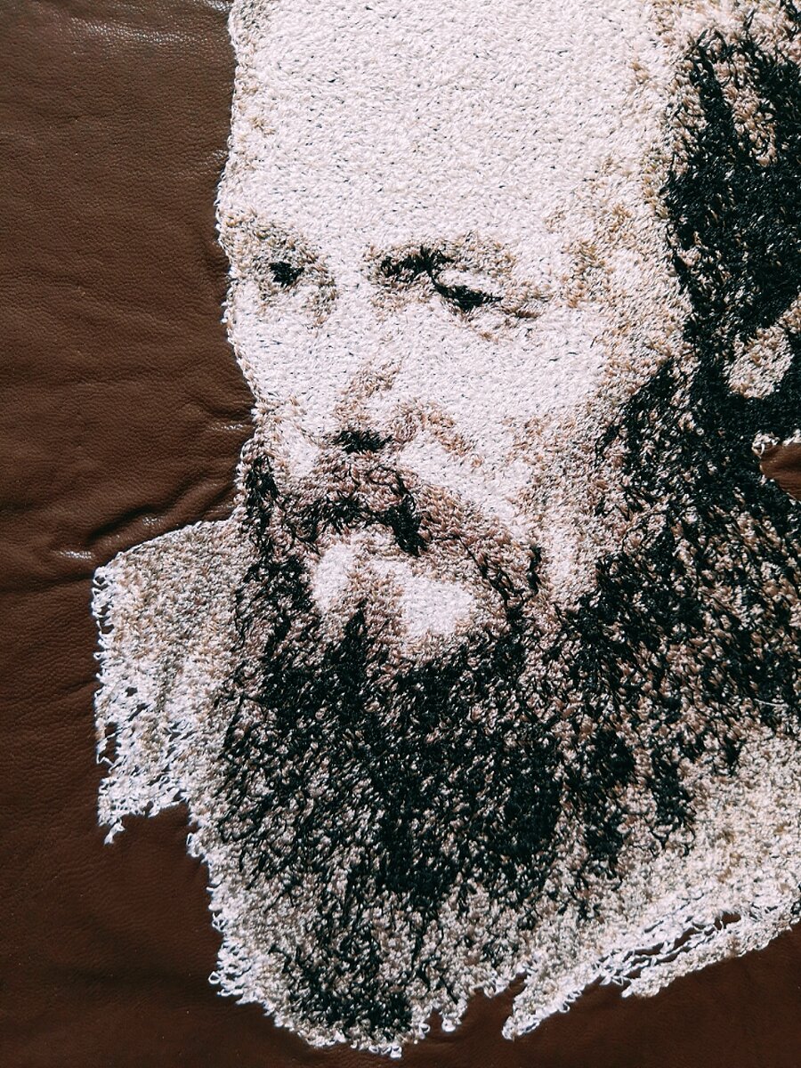 Интересно, что же ваше воображение нарисовало, когда вы прочитали название статьи? Я плотно занимаюсь машинной вышивкой, поэтому хочу вас познакомить с фотостежком. Для тех, кто устал от крестиков, глади или просто хочет разнообразия, пройдемте, я покажу нечто новое! Это ни на что не похожая техника вышивки. На мой взгляд, одна из самых реалистичных. Портреты, натюрморты, пейзажи – все одинаково хорошо ей удается! Рассмотрим на примере вышивки известного портрета. Вы узнали? По сути – это хаотичное переплетение стежков с соблюдением цветопередачи. Вы только посмотрите на детали вблизи. А каков результат! Вышивала на экокоже впервые, для какой цели – пока секрет, но, может быть, вы уже по выкройке догадались? А? =) Постараюсь сделать «жатый» эффект. В данной вышивке использовались 5 цветов черно-белой палитры. В планах еще несколько портретов и картин выполнить в технике фотостежка. Кстати говоря, в отличие от крестика и глади, фотостежок почему-то не сильно утруждает машинку, справляет