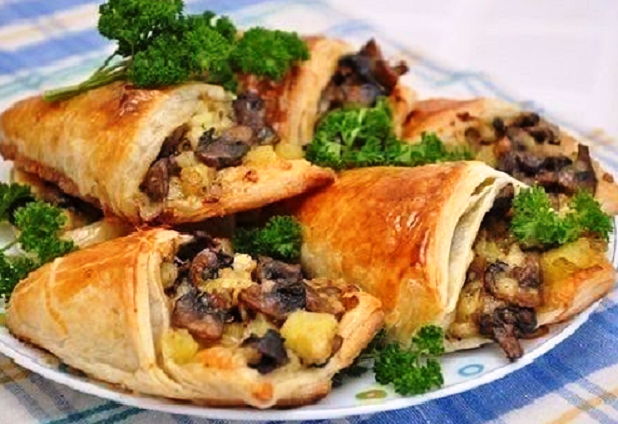 2. Слоеное тесто заранее достаем из морозилки, затем разрезаем его на примерно одинаковые прямоугольники и смазываем их слегка взбитыми яйцами. Каждый кусок теста сворачиваем "кулёчком" (смазанной стороной внутрь) и наполняем картофельно-грибной начинкой.