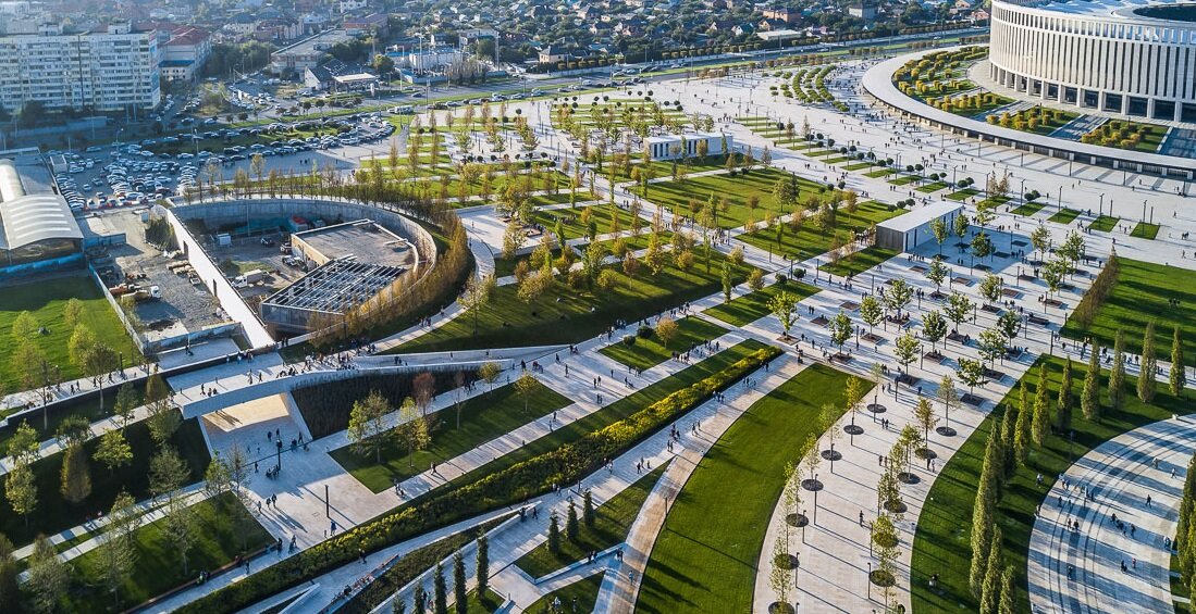 Вы наверняка уже слышали о главных достопримечательностях Краснодара (да и всей России) последних лет - стадионе и парке Краснодар. Данные творения были построены на инвестиции краснодарского бизнесмена Сергея Галицкого. Сам проект нетипичен для России, он поражает своими масштабами и невероятными архитектурными и дизайнерскими решениями! Повсюду разные уровни, и если с высоты птичьего полета это просто красивый узор, то с уровня посетителя парка тут тебе и каньоны, и холмы. Гулять по такому пространству не надоедает. Конечно же, в парке огромное количество разнообразных деревьев и растений, выведенных и привезённых из зарубежья. Удивительно то, что парк всё еще расширяется, хотя и был открыт в 2017 году. Совсем недавно появилась ещё одна новая зона - с фонтанами, зелёными лабиринтами, необычными деревьями и водоёмами и множеством стильных лавок. Кстати, здесь можно сделать кучу стильных фотографий в разных локациях, ведь куда ни встань - везде красота! Одним из самых необычных мест па