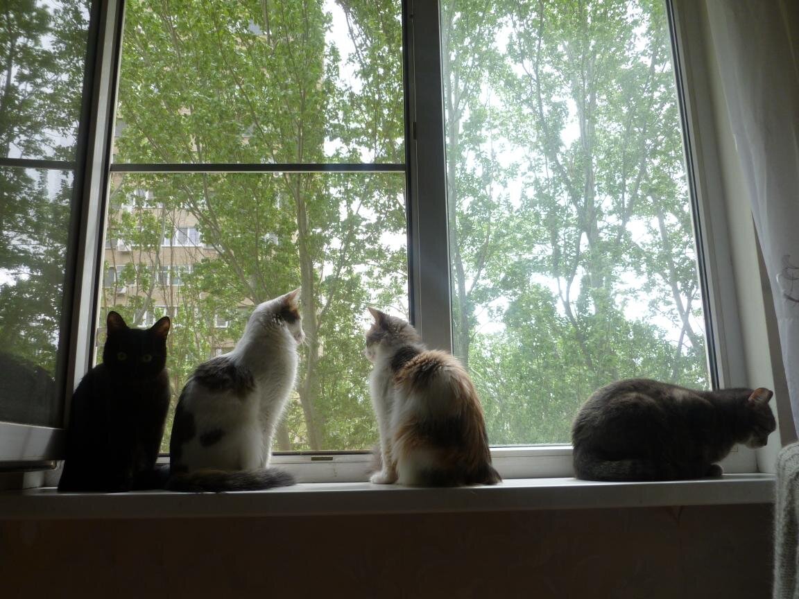 Это только половина нашего прайда. слева направо -Миша, Мира, Маруся и Муся. у каждого своя история. но все любимы и зацелованы. Летом любители смотреть в окно на птичек.