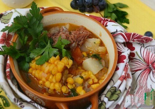 Казан - это большой котёл с округлым дном и толстыми стенками, в котором готовят традиционные блюда из мяса и овощей, а также знаменитый плов в различных вариациях. Готовить в нём удобно и просто, поскольку он пригоден для приготовления пищи как в домашних условиях - на огне газовой плиты, так и на открытом воздухе - на дровяном очаге. Ниже вы найдете пару несложных рецептов блюд, которые лучше всего готовить в казане. Шурпа с кукурузой Шурпу (она же шорва или чорба) готовят с айвой, сливой, сухофруктами, нутом и даже кукурузой. Для приготовления этого вкусного супа потребуется около трети килограмма любого мяса, 5 крупных картофелин, по 2 больших моркови, луковицы, болгарских перца и столько же початков кукурузы, а также томатная паста или помидор, растительное масло, свежая зелень, столовая ложка соли и специи по вкусу. Особенность этого блюда в том, что основные ингредиенты, т.е. мясо, картофель и морковь, нарезают крупно. Кукурузу необходимо предварительно вымыть и отварить до