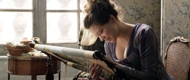 Чтица королевы Марии-Антуанетты Сидони - прекрасная вышивальщица, но скрывает это ото всех, потому что королева больше любит туалеты, а не книги, а Сидони, в свою очередь, предпочитает быть чтицей, чем вышивальщицей, и это предпочтение понятно и мне. Но Сидони - добрая девочка, и, когда королева не желает ее слушать, с удовольствием помогает своей подружке шить гобелен для подружкиной госпожи. Госпожа мало-мало заботится о своей вышивальщице - удобный станок, расположение у окна. Мария-Антуанетта, пишут, сама любила вышивать по канве петитом, но в этом фильме она только жгла письма, любезничала с фавориткой и заказывала новое платье. С георгинами по подолу. За пробу вышивки для королевского платья пришлось взяться Сидони, для чего она получила на время альбом Марии-Антуанетты с наборами тканей и схемами. Шьет при свече, ночами, наверное, это символизирует преданность королеве. Вышивка готова, награду за нее получит королевская вышивальщица, а Сидони достанется совсем другое, то