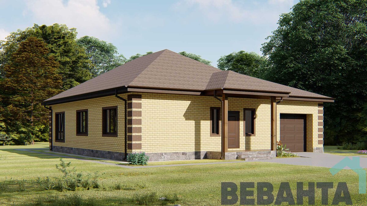 Одноэтажный дом по проекту "Холидэй" - это идеальный представитель загородной застройки, включающий в себя комфортную и рациональную планировку и красивые фасадные решения.