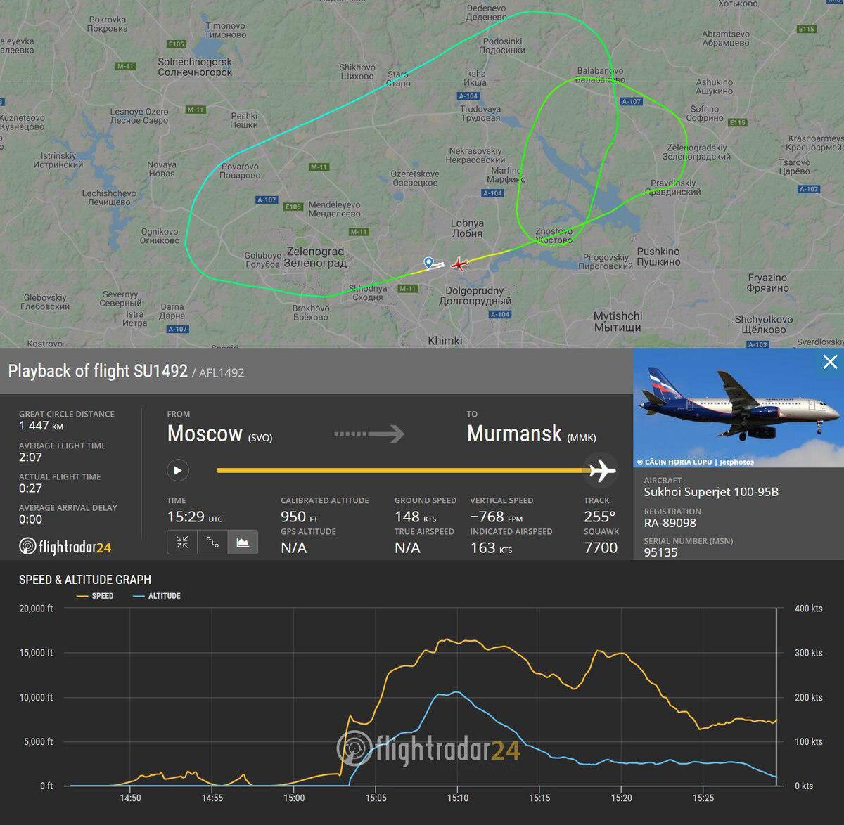 Самолёт Sukhoi Superjet авиакомпании Аэрофлот с регистрационным номером RA-89098, выполнявший рейс SU1492 Москва - Мурманск, через 8 минут после взлёта запросил экстренное снижение. Далее через 15 минут, практически перед самой посадкой, экипаж передал на землю сигнал аварийной ситуации и в 18:29 приземлился в Шереметьево. Сразу после посадки самолёт загорелся. Следственный комитет России совместно с представителями Межгосударственного авиационного комитета (МАК) изъял речевой и параметрические бортовые самописцы самолета Superjet 100 авиакомпании "Аэрофлот", потерпевшего катастрофу в аэропорту Шереметьево 5 мая, а также аудиозаписи переговоров пилотов с диспетчерской службой и записи с камер видеонаблюдения. "Следствием рассматриваются различные версии произошедшего, среди которых недостаточная квалификация пилотов, диспетчеров и лиц, проводивших технический осмотр борта; неисправность воздушного судна; неблагоприятные метеоусловия", сообщили в СК. По уточненным данным комитета, в ре