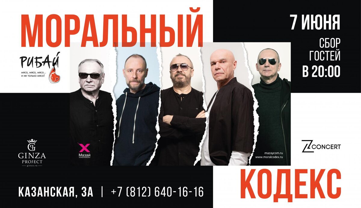 7 июня, в самый разгар Петербургского международного экономического форума, в ресторане «Рибай», состоится концерт легендарной российской рок-группы «Моральный кодекс». Группа «Моральный кодекс» уже несколько десятилетий возглавляет список наиболее популярных и любимых групп в стране, а такие хиты, как «Первый снег», «До свиданья, мама» и «Где ты?» давно занимают особое место в сердцах слушателей. Культовая группа отличается неординарным стилем, высоким качеством исполнения песен и, конечно же, ни на кого не похожей манерой исполнения Сергея Мазаева. В ресторане «Рибай» рок-группа выступит впервые, поэтому петербуржцам, желающим совместить гастрономическое и музыкальное наслаждение, рекомендуем уже сегодня забронировать столики в ресторане на Казанской, 3А. «Рибай» — культовый проект Санкт-Петербурга, где весь персонал заведения обладает творческим талантом: поёт, танцует, показывает фокусы и задаёт волшебную атмосферу гармонии еды и искусства. В «Рибае» уже выступали такие звёзды пер