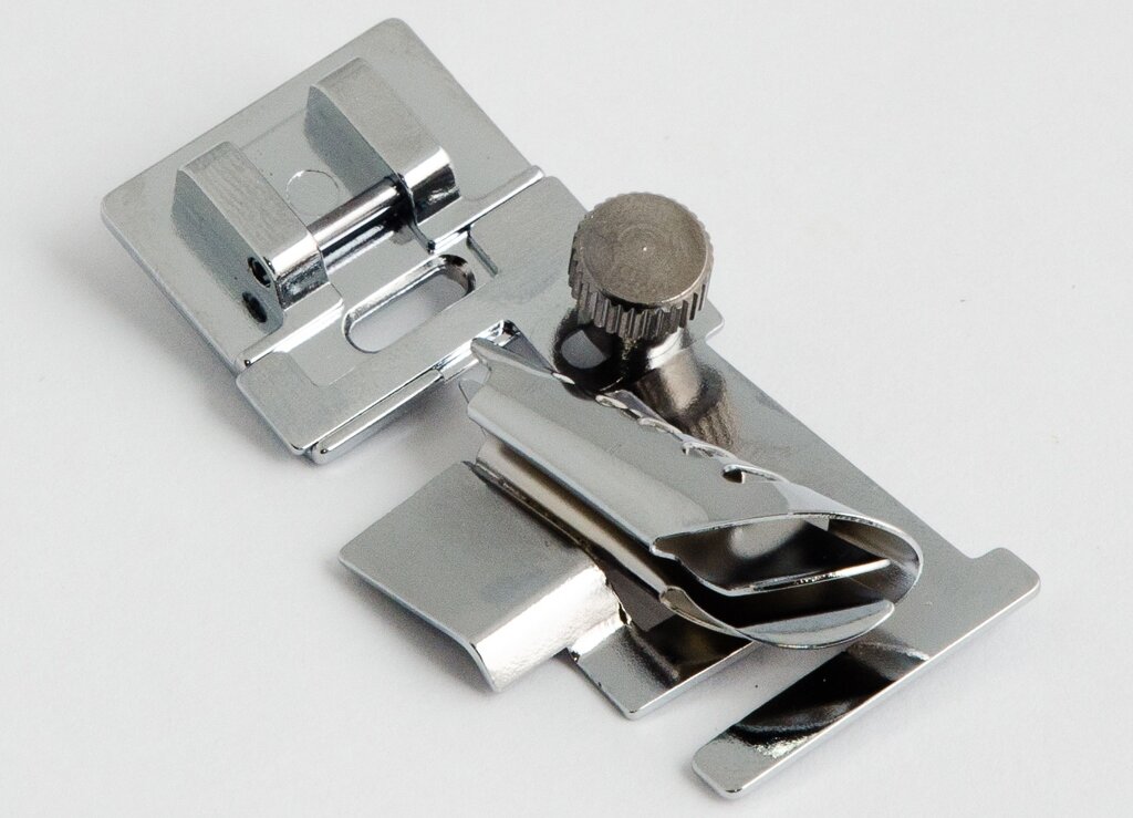 Современная промышленность предлагает сегодня огромный выбор всевозможных аксессуаров для бытовых швейных машин, в т.ч., и лапки для выполнения разных операций. Одной из них является лапка для притачивания косой бейки. Она представляет собой направляющую и одновременно улитку, огибающую срез ткани косой бейкой. К швейной машинке такая лапка крепится за секунду. Справа на её корпусе есть регулировочный винт, позволяющий перемещать узел с улиткой вправо или влево. Это очень удобно, если сама швейная машинка имеет ограниченный набор строчек, которые невозможно подстроить под окантовыватель. В этом случае есть возможность подстроить его под положение иглы. Использование лапки для притачивания косой бейки позволяет выполнять эту операцию за 1 приём. Это, в свою очередь, значительно сокращает трудоёмкость изделия. Особенно актуально это для тех, кто довольно часто и в больших количествах изготавливает изделия с использованием косой бейки. Это могут быть, например, салоны штор, студии теат