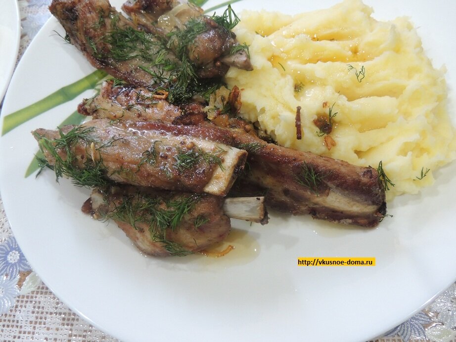 Свиные ребрышки жареные на сковороде с луком и чесноком