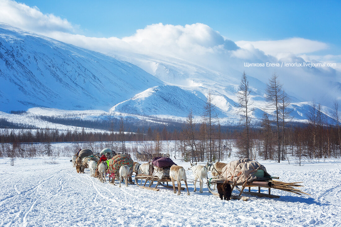 В головной упряжке идут женские нарты, этакая смесь нарт и детской коляски. За ними длинной цепочкой привязаны нарты с поклажей и замыкают этот обоз нарты с шестами для чума.