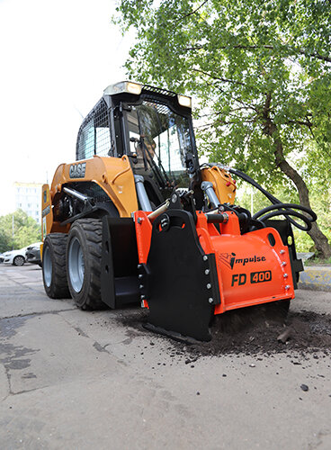 Барабан фрезы Impulse FD 400 спроектирован с учетом динамического стресс-анализа современной САПР, изготовлен на обрабатывающем центре для максимально точной установки резцов, проверен длительными ресурсными испытаниями. Результатом стал идеально сбалансированный рабочий инструмент для точной, комфортной и безопасной работы без вибрации. - Уникальным решением среди навесных дорожных фрез является система стабилизации (самонивелирования) фрезерного барабана на заданной глубине. Эта же система обеспечивает удобство установки фрезы на асфальт, врезание и четкую работу вне зависимости от положения стрелы погрузчика. А раз требования к точности позиционирования фрезы оператором снижены, то за один и тот же промежуток времени самонивелируемой фрезой можно выполнить необходимую задачу до 2 раз быстрее. Такая система используется лишь на профессиональных дорожных фрезах, и Impulse — не исключение.