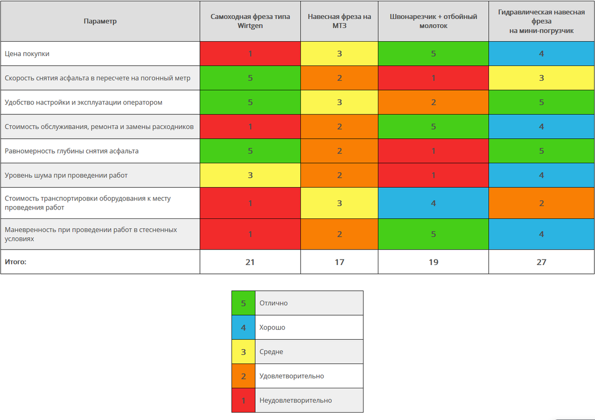 По сумме баллов очевидно, что наиболее рациональным решением для локального ремонта дорожного покрытия является холодное фрезерование асфальта навесными гидравлическими фрезами на мини-погрузчике.