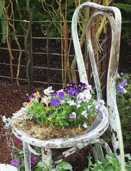 Забавная тенденция дачного дизайна — «цветущая мебель». Попробуйте создать такое чудо в собственном саду. Сделать это проще простого. Для этого Вам потребуются обыкновенные старые предметы интерьера (тумбочки, столы, шкафы — все, что у вас есть) и немножко фантазии. У Вас получится уникальный предмет декора, достойный того, чтобы стать ярким акцентом на садовом участке. Сначала займитесь преображением старой мебели. Для этого мебель можно просто перекрасить, а в идеале — декорировать. Например, искусственно состарить, сымитировать облупившуюся краску или старую фреску. Теперь возьмите в руки лобзик и во всех возможных и невозможных плоскостях (сиденьях, столешницах, полочках и подставках) выпилите отверстия для горшков или контейнеров с растениями. Осталась только выбрать подходящие растения для каждого из объектов и составить общую декорацию! Ваша "клумба на стуле" будет одинаково хорошо смотреться и в «сольном» варианте, и в пестрой компании других цветочных контейнеров и все