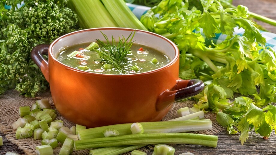- Сельдереевый суп расщепляет жиры и выводит лишнюю жидкость из организма, в нем практически нет калорий. Для приготовления нарежьте корень сельдерея – 200 г, фасоль стручковую – 400 г, кочан капусты, болгарский перец – 2 шт., помидоры, лук, морковь по 6 шт., залейте все 1,5 литра томатного сока и варите около 20 минут. В конце добавить нарезанную зелень.
