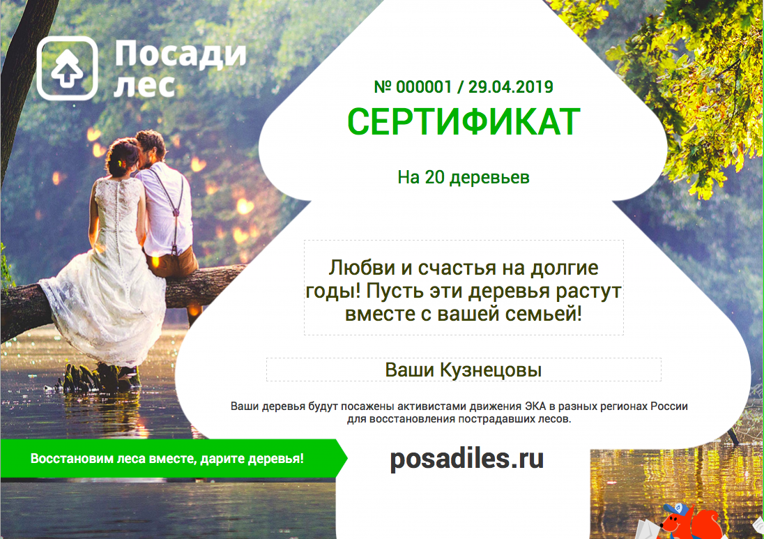 В преддверии свадебного сезона проект “ПосадиЛес” предлагает сделать запоминающийся, добрый и экологичный подарок новой семье - настоящий живой лес. Для этого на сайте posadiles.ru нужно выбрать количество деревьев, внести пожертвование на их посадку и оформить свадебный подарочный сертификат. Деревья будут высажены весной и осенью волонтерами движения ЭКА на пострадавших лесных территориях в регионах России. В подарочный сертификат как в открытку можно вписать текст поздравления с пожеланиями и посвятить будущий лес молодоженам. После посадки сервис вышлет обладателям сертификата фото и GPS-координаты саженцев. Молодые деревья будут высажены на территориях, специально подготовленных местными лесничествами, они же будут осуществлять последующий уход за деревьями. Лес станет символом любви и долгих лет совместной счастливой жизни ваших близких. Посаженные в честь молодоженов деревья также станут вашим вкладом в будущее и отличной альтернативой цветочным букетам, которые быстро погибают