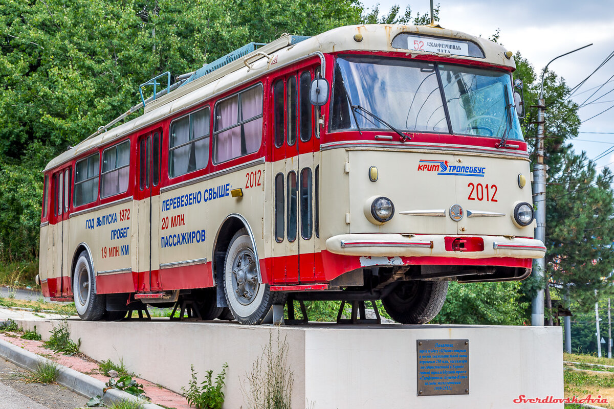 Памятник стоит прямо напротив остановки и поста ГАИ. Как гласит надпись:" Памятник троллейбусу "Шкода" открыт в честь знаменательной даты, перевозки 250 млн. пассажира на единственной в Европе горной троллейбусной трассе "Симферополь-Алушта-Ялта" за годы эксплуатации 1959-2012г.". Данный экземпляр выпущен в 1972 году, за время эксплуатации прошел 1,9 миллиона километров!!! Это почти пятьдесят кругосветных путешествий! Двадцать миллионов перевезенных пассажиров это тоже выдающееся достижение. Интересно бортовой номер настоящий или в честь установки? Сейчас троллейбусы этой модели не используются на междугородних маршрутах, а вот на внутрегородских еще работают несколько экземпляров. В следующий раз мы рассмотрим действующий экземпляр на