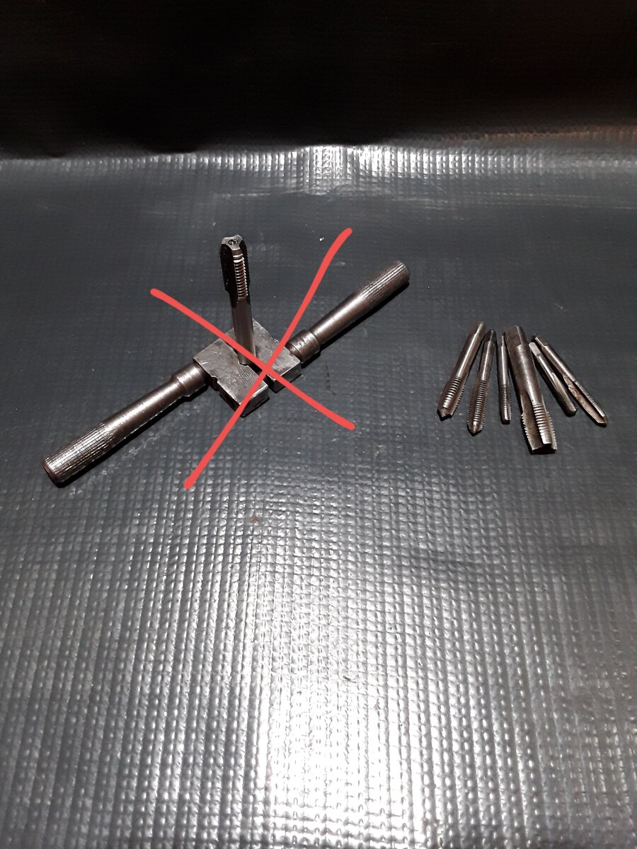 Найти подходящие по длине болтики, и проверить, как зажимаются в держателе метчики. В отверстии ø 11мм., устанавливаются метчики - М10, М12, М14.