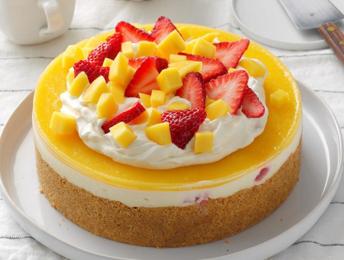 Чизкейк - любимый десерт моей мамы. Я сделала это специально для нее в День Матери, чтобы поблагодарить ее за то, что она такая классная мама. Украсьте на свой вкус! Ингредиенты: 2 стакана крошки из печенья 2/3 стакана масла, растопленного 1/3 стакана сахара Начинка: 1 пакетик желатина 3 столовые ложки холодной воды 2 пакета сливочного сыра, мягкого 1-1 / 3 чашки сахара 1 чашка взбитых сливок 2 чайных ложки ванилина 1/2 большого манго, очищенного и нарезанного кубиками (около 3/4 стакана) 4 свежие клубники, нарезанной Глазурь: 1 пакетик желатина 3 столовые ложки плюс 1/2 стакана холодной воды, разделенные 1/2 большого манго, очищенного и нарезанного кубиками (около 3/4 стакана). Взбитые сливки Приготовление по шагам: ШАГ-1: В миске смешайте крошки из печенья, масло и сахар. Выложите получившуюся массу в форму для чизкейка. ШАГ-2: Для начинки, в микроволновой печи, залейте желатин холодной водой; дать постоять 1 минуту.Разогрейте в микроволновке 30-40 секунд. Перемешайте и дайте посто