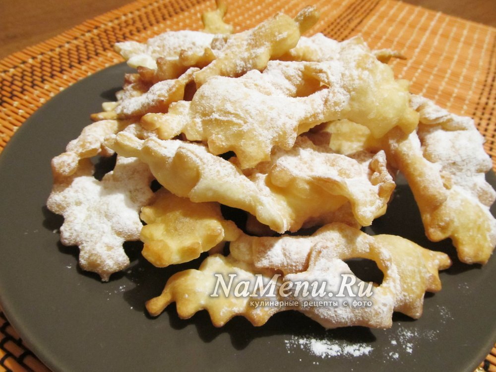 Необходимые продукты: - куриное яйцо – 1 шт., - холодная вода – 2 ст.л., - водка – 2 ст.л., - сахар – 1 ч.л., - пшеничная мука – 280-300 гр., - соль – щепотка, - растительное масло для жарки, - сахарная пудра для посыпки 🥣В миске смешайте яйцо, сахар и соль 💧Добавьте водку и холодную воду, перемешайте 🥠Всыпьте муку, замесите тесто, оставьте на 5-10 мин. 🔪Тесто разделите на 2 части, раскатайте его в пласт (2-3 мм), нарежьте на средние ромбы, в центре каждого прорежьте отверстие. Один угол ромба «пропустите» через центральное отверстие 🔥Жарьте хворост в большом количестве растительного масла (во фритюре) ❕В конце посыпьте пудрой https://namenu.ru/10020/Vkusnyj_hvorost_tayuwij_vo_rtu/
