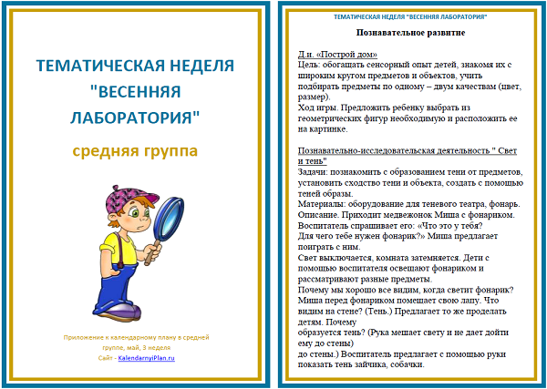 Календарное планирование на май, средняя группа Дети средней группы в конце учебного года способны устанавливать простые причинно-следственные связи и проявляют интерес к экспериментированию. Согласно рекомендациям программы "От рождения до школы" в середине мая происходит закрепление знаний и умений детей. Мы предлагаем на этой неделе открыть весеннюю лабораторию, которая позволит детям получить ответы на интересующие их вопросы. Педагог планирует разнообразные эксперименты в группе и на прогулке с песком, светом и тенями, водой и магнитами, привлекает детей к работе с карточками "Превращения", рассказывает о дневнике наблюдений. Описание игровых приёмов, познавательной деятельности, тем для художественного творчества, стихи и считалки вы найдёте в приложении к плану «Тематическая неделя «Весенняя лаборатория». Социально-коммуникативное развитие Каждое утро начинается с приветствия и в течение дня педагог беседует с детьми о безопасности, профессиях родителей, вспоминает о достопримеч