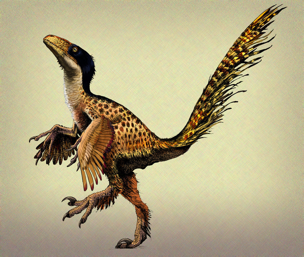 Всем огромный дино-привет! Когда-то я обещала рассказать об еще одной версии теплокровности динозавров. Вуаля! Вы, наверно, уже слышали о том, что некоторые динозавры обладали перьевым покровом. Прямые доказательства этому появились в середине 90-х годов, когда в Китае (провинция Ляонин) были найдены останки мелких хищных динозавров с отпечатками перьев. Да, все началось со следов перьев. Вокруг скелетов динозавров отпечатались их четкие контуры: мягкие ткани успели разложиться, но перьевой покров жестче и разлагается дольше, поэтому он успел оставить свой след на камне. На картинке вы можете видеть микрораптора – он обитал на северо-востоке Китая 125 миллионов лет назад. Принадлежал семейству Дромеозавров – они жили на деревьях и использовали перья для планирования. У микрораптора перья имелись не только на передних конечностях и хвосте, но и на задних ногах. Так что, можно сказать, этот динозавр был четырехкрылым. Сейчас точно известно, что у 8 семейств хищных динозавров-теропод