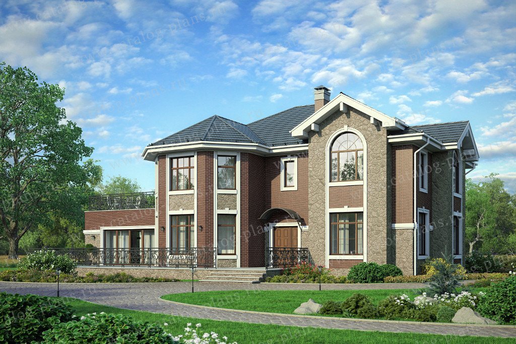 Проект просторного двухэтажного дома из газобетона с бассейном с габаритными размерами 20 х 13 м и общей площадью 304 м2. Это модификация проекта 48-29, сделанная с учетом более ограниченного участка. Классический образ этого дома обогащается выразительным эркером и арочными окнами на главном фасаде и подчеркнут темно-коричневым цветом в сочетании с естественным оттенком камня. Вход в дом организован с просторной террасы. Планировка разбита на зоны, каждая со своим функциональным назначением. Сердцем гостевой зоны является большая гостиная с камином, пространство которой свободно перетекает в кухню-столовую. Кухня открытого типа зрительно увеличивает помещение. На первом этаже так же располагается гостевая комната. Следующую зону представляет бассейн со всеми вспомогательными помещениями, включая сауну, душевую и хамам. Бассейн имеет свой выход на террасу. Второй этаж представляет собой зону для отдыха хозяев, где расположены четыре спальни. Одна из комнат имеет свой выход еще на одну