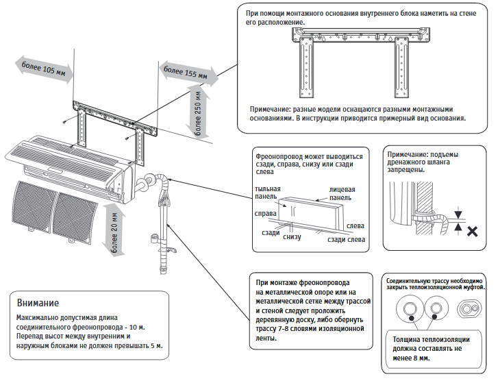 ИНСТРУКЦИЯ ПО МОНТАЖУ Выбор места монтажа внутреннего блока - Запрещается заграждать воздухозаборные и воздухораспределительные отверстия. - Перепад высот между внутренним и наружным блоками не должен превышать 5 м. - Стена должна быть достаточно прочной, чтобы выдерживать массу агрегата и предотвращать его вибрацию. - Блок не должен располагаться под воздействием прямых солнечных лучей. - Необходимо обеспечить надлежащий отвод конденсата и подключение дренажной линии к наружному блоку. - Блок не должен располагаться вблизи ламп дневного света.Выбор места монтажа наружного блока - Блок должен располагаться на расстоянии не менее 1 метра от телевизора, радиоприемника и других бытовых приборов. МОНТАЖ ВНУТРЕННЕГО БЛОКА Примечание: вид монтажной пластины в разных моделях отличается; в данной инструкции их изображение приводится только для иллюстрации. Монтажная пластина должна быть закреплена на прочной стеновой конструкции. Если используются анкерные болты, следует просверлить