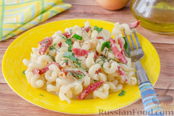 А вот невероятно сытные и простые в приготовлении макароны с колбасой и яйцами. Несомненный плюс этого блюда в том, что оно готовится быстро, буквально 20 минут, а значит вашим близким не придется долго ждать вкусного завтрака.