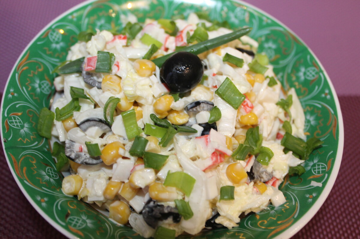 Салат из пекинской капусты с крабовыми палочками - один из популярных салатов на нашем столе. Блюдо имеет приятный свежий вкус. Такой салат никого не оставит равнодушным. Салат из пекинской капусты и крабовых палочек станет достойным праздничным блюдом на любом столе. Если вы любите крабовые палочки и хотите приготовить из них интересный и вкусный салат, то попробуйте этот рецепт. В приготовлении нет ничего сложного и за короткое время вы приготовите оригинальный салат, который украсит ваш стол. Ингредиенты : · Капуста пекинская — 300 г · Крабовые палочки — 200 г · Кукуруза — 1 бан. · Маслины · Майонез — 5 ст. л. · Зелень (Для украшения) — по вкусу · Соль— по вкусу Время приготовления: 15 минут Количество порций: 6 Рецепт: